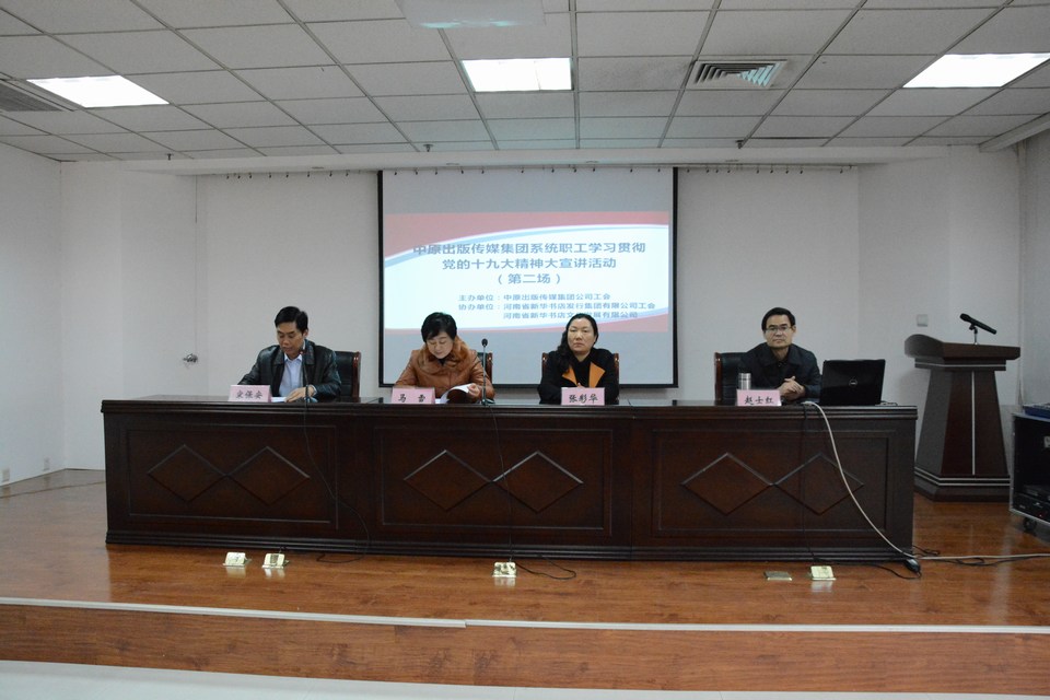 12月27日下午,按照《河南省總工會(huì)關(guān)于開(kāi)展河南省職工 學(xué)習(xí)貫徹黨的十九大精神 千名勞模大工匠·萬(wàn)場(chǎng)大宣講活動(dòng)的通知》要求,由中原出版?zhèn)髅郊瘓F(tuán)主辦、河南省新華書(shū)店發(fā)行集團(tuán)承辦的出版集團(tuán)系統(tǒng)職工第二場(chǎng)學(xué)習(xí)貫徹黨的十九大精神宣講會(huì)在發(fā)行集團(tuán)四樓會(huì)議室舉行,中原出版?zhèn)髅郊瘓F(tuán)黨委委員、副總裁、集團(tuán)直屬單位黨委書(shū)記馬雪總裁,集團(tuán)工會(huì)副主席、集團(tuán)直屬單位黨委副書(shū)記張彩華主席出席會(huì)議,發(fā)行集團(tuán)班子成員、中層人員、部分黨員和職工代表,及來(lái)自河南省新華書(shū)店文化發(fā)展公司、銷售與市場(chǎng)雜志社、《中學(xué)生學(xué)習(xí)報(bào)》社、出版對(duì)外貿(mào)易公司共6家單位150余名干部職工參加了此次宣講學(xué)習(xí)活動(dòng)。