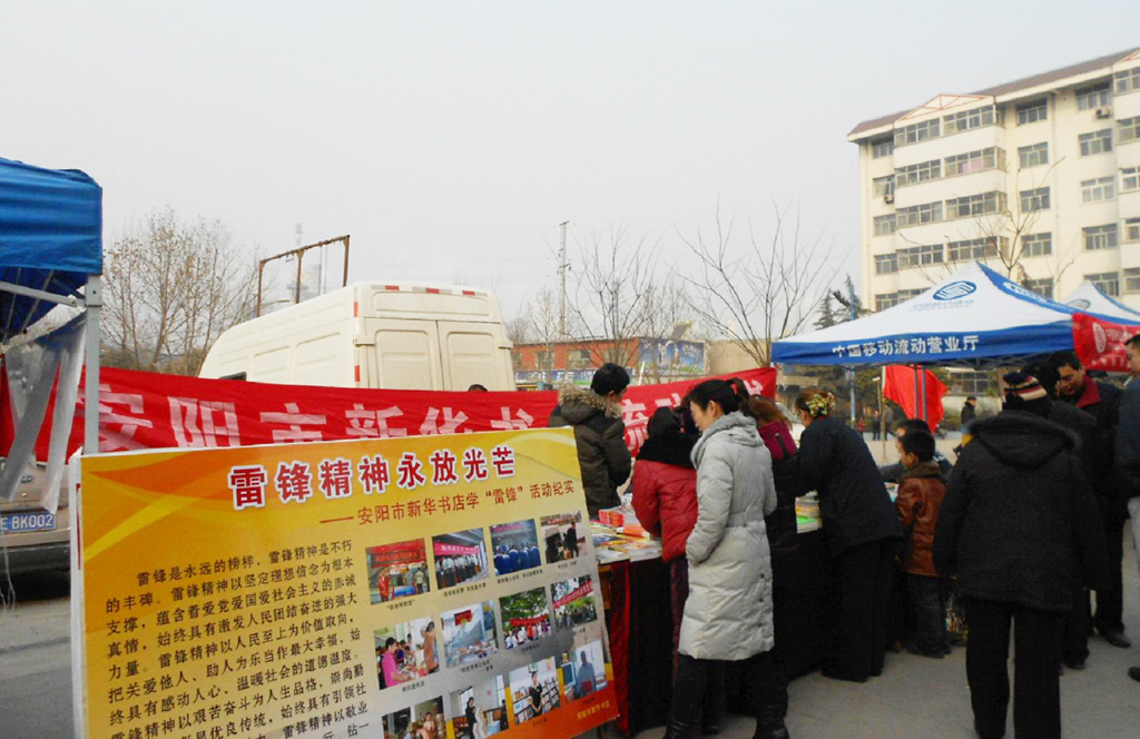 為了弘揚(yáng)雷鋒精神,方便廣大讀者購(gòu)書,在紀(jì)念雷鋒同志犧牲五十周年之際,安陽(yáng)圖書音像城積極與安陽(yáng)化肥廠團(tuán)委聯(lián)系,精心挑選紀(jì)念雷鋒同志的相關(guān)圖書、暢銷書組成流動(dòng)書店,到化肥廠住宅小區(qū)為廣大職工和家屬提供流動(dòng)售書服務(wù),取得了良好的社會(huì)效益和經(jīng)濟(jì)效益;顒(dòng)不僅滿足了企業(yè)干部職工的精神文化需求,而且較好地解決了企業(yè)干部職工買書難的問(wèn)題,進(jìn)一步樹(shù)立了新華書店的良好社會(huì)形象。