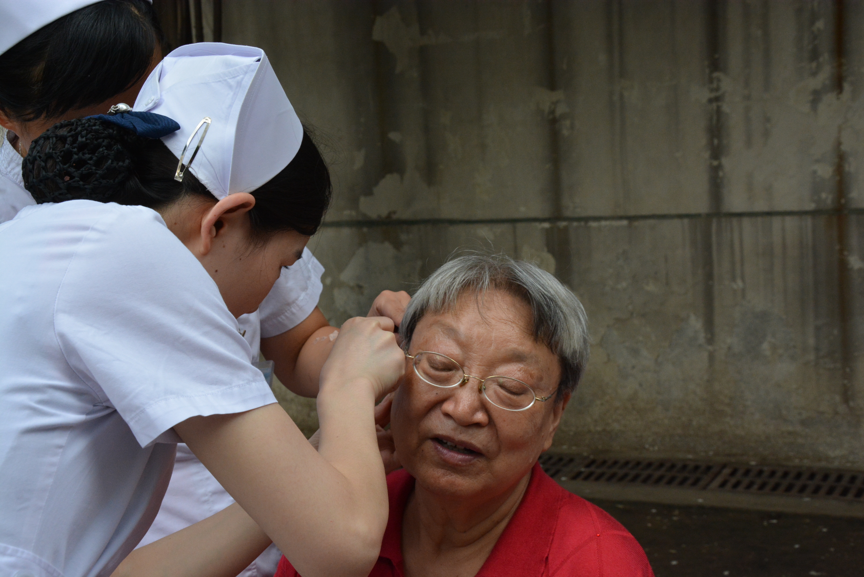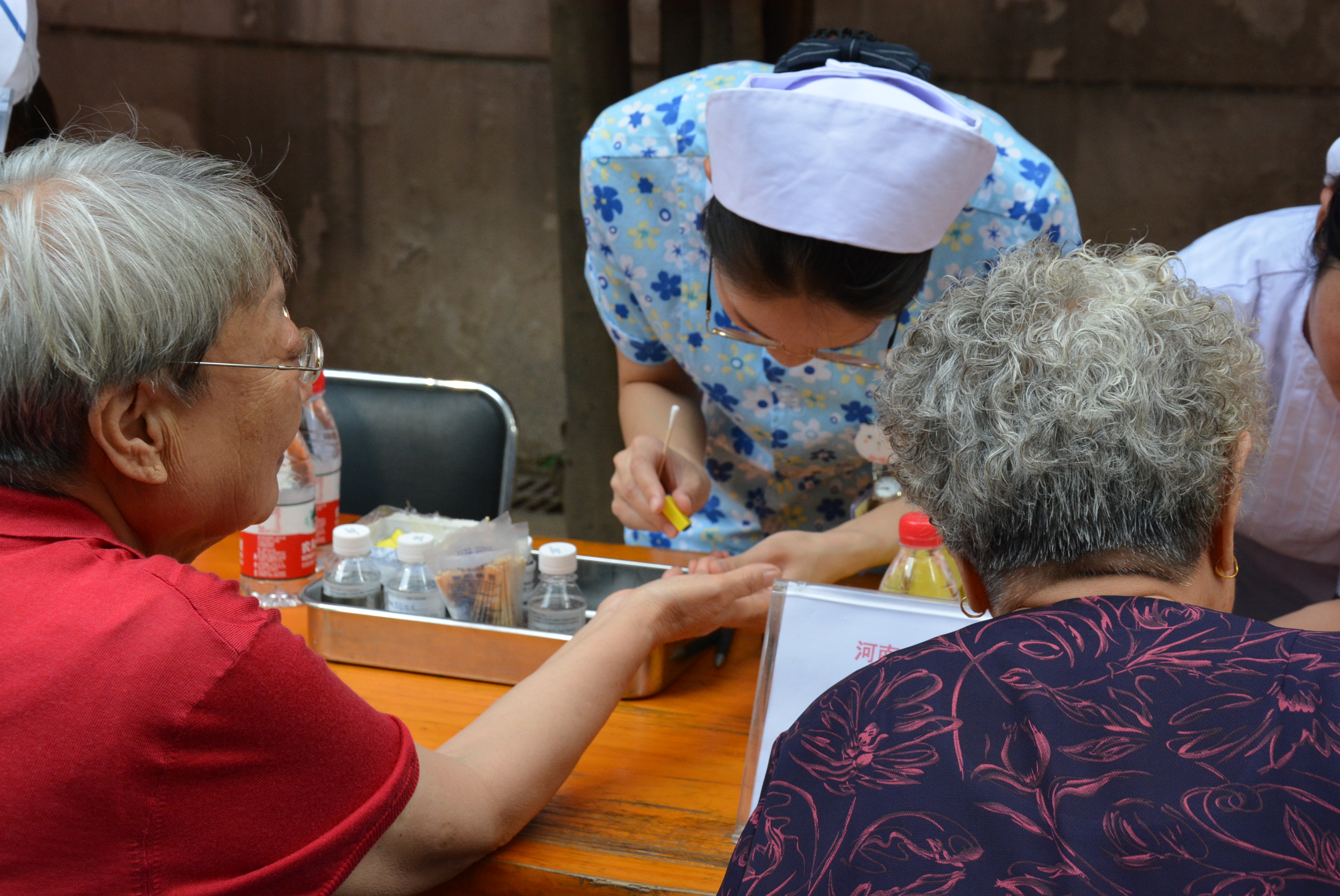 在診療檢測(cè)過程中,檢測(cè)結(jié)果基本正常的大爺大媽,臉上都露出了舒心輕松的笑容;也有個(gè)別做耳穴貼壓者,因有些疼痛而呲牙咧嘴憨笑的。整個(gè)活動(dòng)現(xiàn)場(chǎng),醫(yī)務(wù)人員既忙碌,又有條不紊;候診的社區(qū)居民,在現(xiàn)場(chǎng)工作人員的指引下,秩序井然,有序等候。