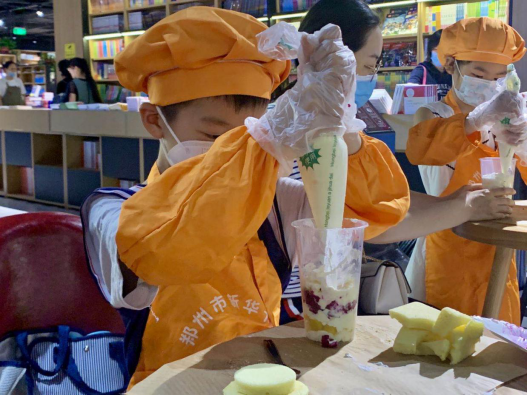 接下來就是令人期待的蛋糕杯制作環(huán)節(jié)。家長與孩子一起將新鮮烤好的蛋糕胚剪切成合適的形狀及大小并放入杯中,擠上香甜的奶油,加入新鮮水果果肉。持續(xù)重復(fù)這個過程,直到杯子被蛋糕材料填滿,最后撒上烤得脆香的美國杏仁片,一杯充滿愛意的蛋糕杯就做好了。