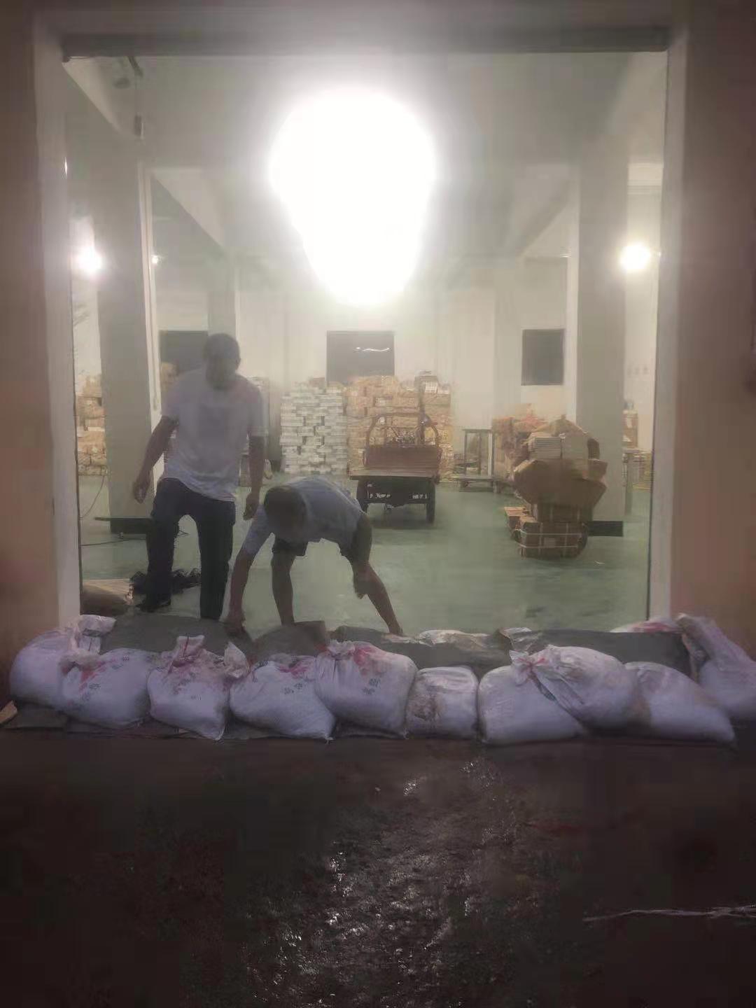 扶溝縣新華書店職工用沙袋堵住雨水進入倉庫