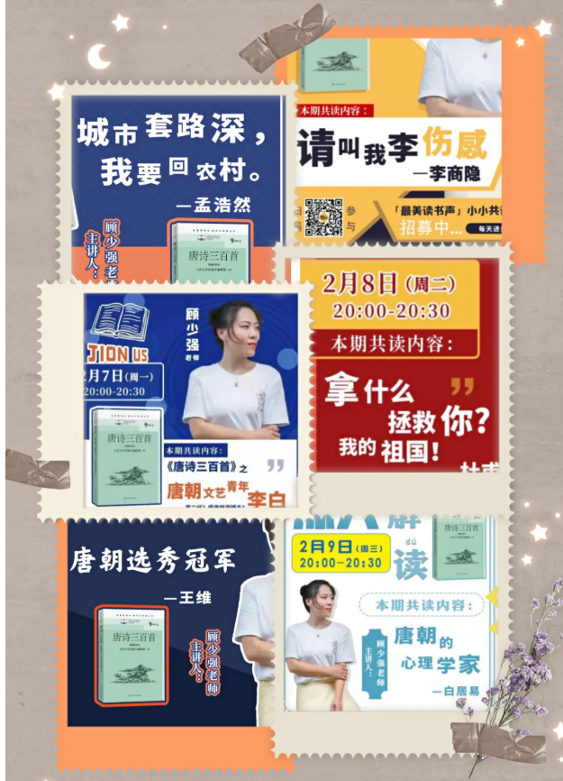 我們共同學(xué)習(xí)了“我拿什么拯救你?我的祖國(guó)!——杜甫”“唐朝的心理學(xué)家——白居”“城市套路深,我要回農(nóng)村——孟浩然”“唐朝選秀冠軍——王維”等精彩的精讀內(nèi)容。