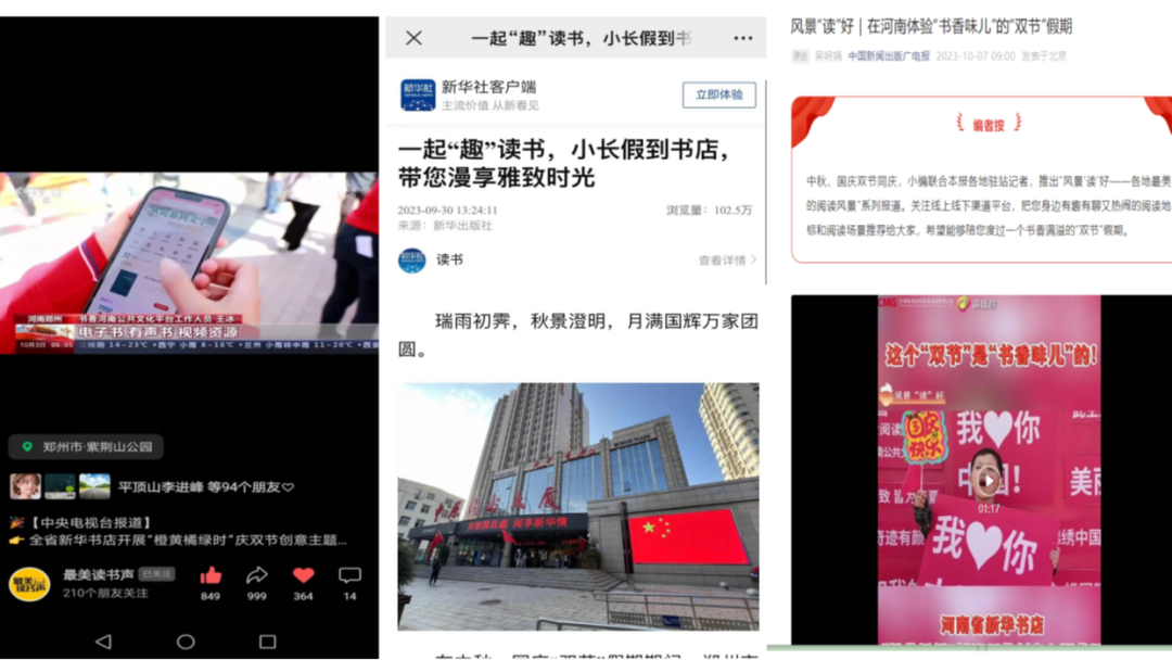 活動期間,各地新華書店協(xié)同發(fā)力,通過體驗式、沉浸式、互動式的文化表達形式,將線上線下充分融合,吸引眾多媒體爭相報道。9月30日,新華社客戶端以“一起‘趣’讀書,小長假到書店帶您漫享雅致時光”為題進行報道;10月2日,#國慶的河南是書香味兒的#等活動相關(guān)話題登上微博熱搜,閱讀量突破240萬次;10月3日,中央電視臺新聞頻道對整體活動進行重點報道。此外,學(xué)習(xí)強國、中國新聞出版廣電報、河南日報、河南電視臺、文旅中國、頂端新聞、今日頭條等權(quán)威媒體平臺共同聚焦報道,線上話題瀏覽量達到707.3萬次,全平臺總瀏覽量超2000萬次,有力實現(xiàn)了書香河南全民閱讀品牌的破圈傳播。