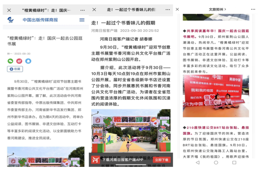 在剛剛結(jié)束的“雙節(jié)”8天小長假中,由省委宣傳部指導(dǎo),中原出版?zhèn)髅郊瘓F主辦,河南省新華書店發(fā)行集團、全省各級新華書店聯(lián)動承辦的“橙黃橘綠時”迎雙節(jié)創(chuàng)意主題書展暨書香河南公共文化平臺推廣活動,在全省市、縣(區(qū))文化地標處圓滿舉辦。528場次的惠民書展、創(chuàng)意閱讀、潮流文旅、誦經(jīng)典、拆盲盒、手工制作等繽紛活動,深受人民群眾喜愛。