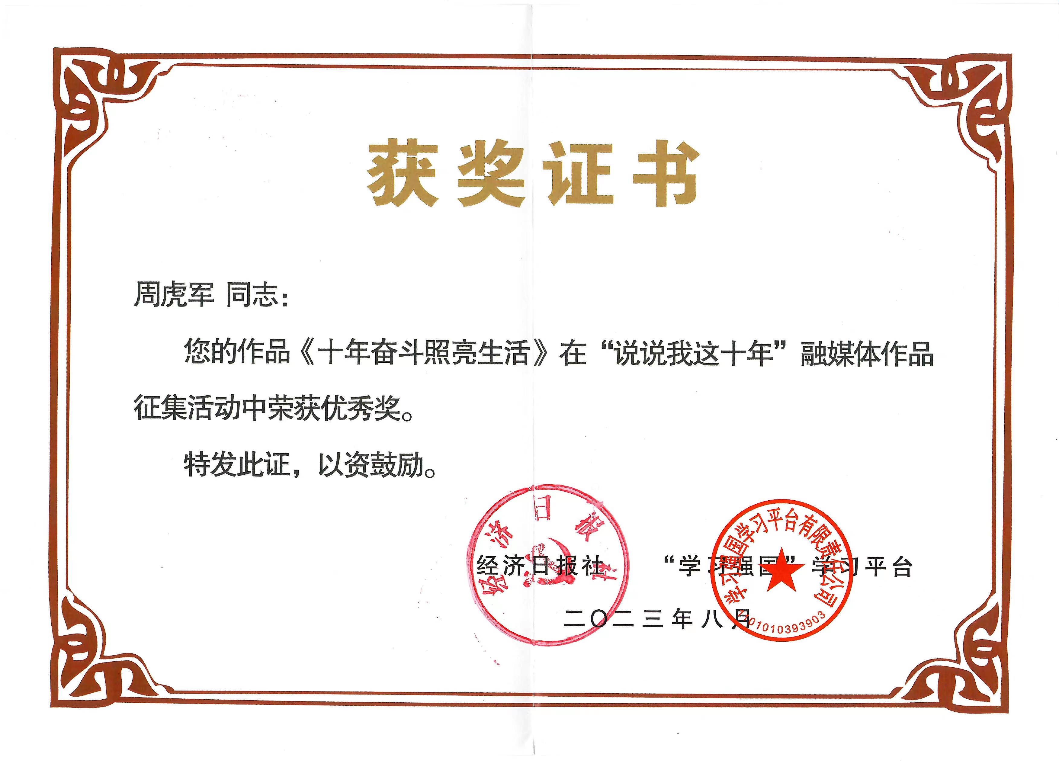 經(jīng)專業(yè)評選委員會(huì)嚴(yán)格評審,共有105篇投稿作品獲獎(jiǎng),其中“一等獎(jiǎng)”2篇,“二等獎(jiǎng)”5篇,“三等獎(jiǎng)”10篇,“優(yōu)秀獎(jiǎng)”88篇。鞏義市店員工周虎軍的作品《十年奮斗 照亮生活》榮獲“優(yōu)秀獎(jiǎng)”。