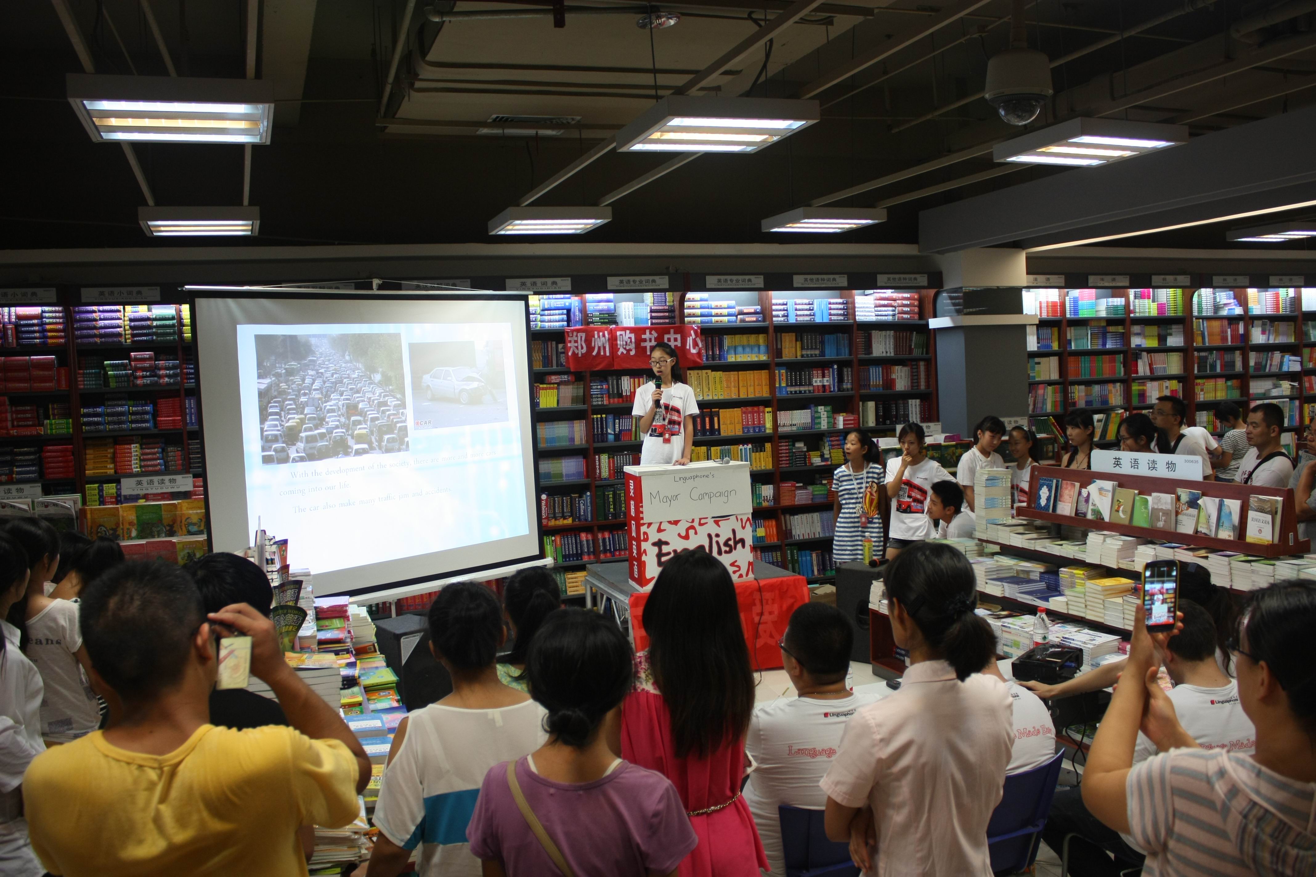 為回饋廣大外語愛好者的厚愛,日前鄭州市店外語角活動如期舉辦。本次活動采用演講比賽的形式,規(guī)定以“市長競選”為主題,在鄭州市店購書中心三樓外文書店內(nèi)開辟場地,搭設(shè)演講臺,配備投影儀及音響設(shè)備,并特別邀請了“靈格風(fēng)”外語培訓(xùn)機構(gòu)的專業(yè)外教擔(dān)任評委;顒赢(dāng)天,選手們精神飽滿,準(zhǔn)備充分,以流利的英語口語和抑揚頓挫的語調(diào)博得現(xiàn)場陣陣掌聲,同時活動也吸引了眾多讀者的圍觀和參與,大家紛紛踴躍地對參賽選手進行互動投票,最后該店工作人員對專家和大眾評審的結(jié)果進行了匯總,現(xiàn)場公布了參賽選手的獲獎名次,并為他們頒發(fā)了精心準(zhǔn)備的獎品。