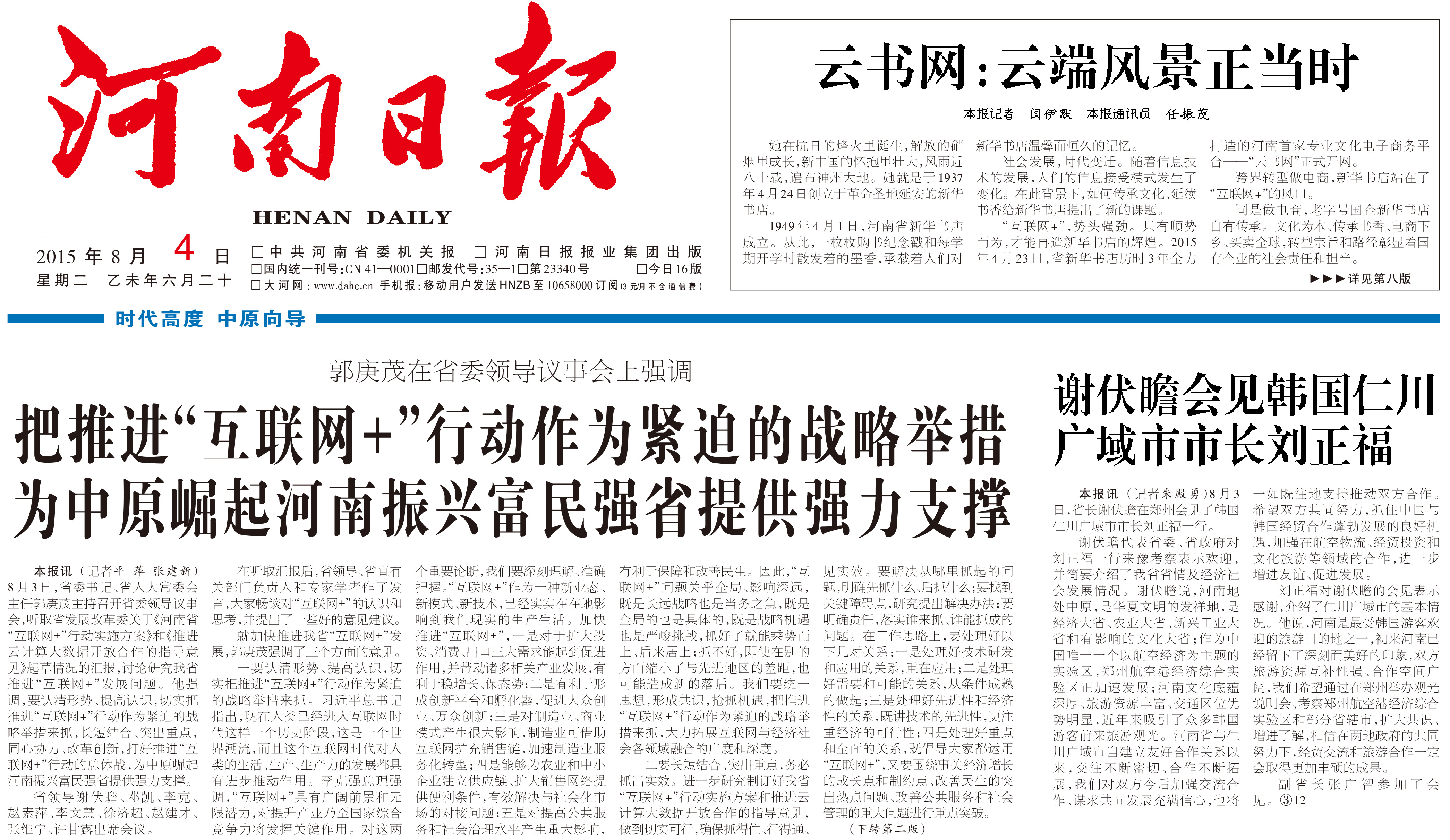 8月4日《河南日報(bào)》在頭版報(bào)眼位置對云書網(wǎng)進(jìn)行了報(bào)道,與郭庚茂書記強(qiáng)調(diào)把推進(jìn)“互聯(lián)網(wǎng)+”行動(dòng)作為緊迫的戰(zhàn)略舉措,同登《河南日報(bào)》頭版。