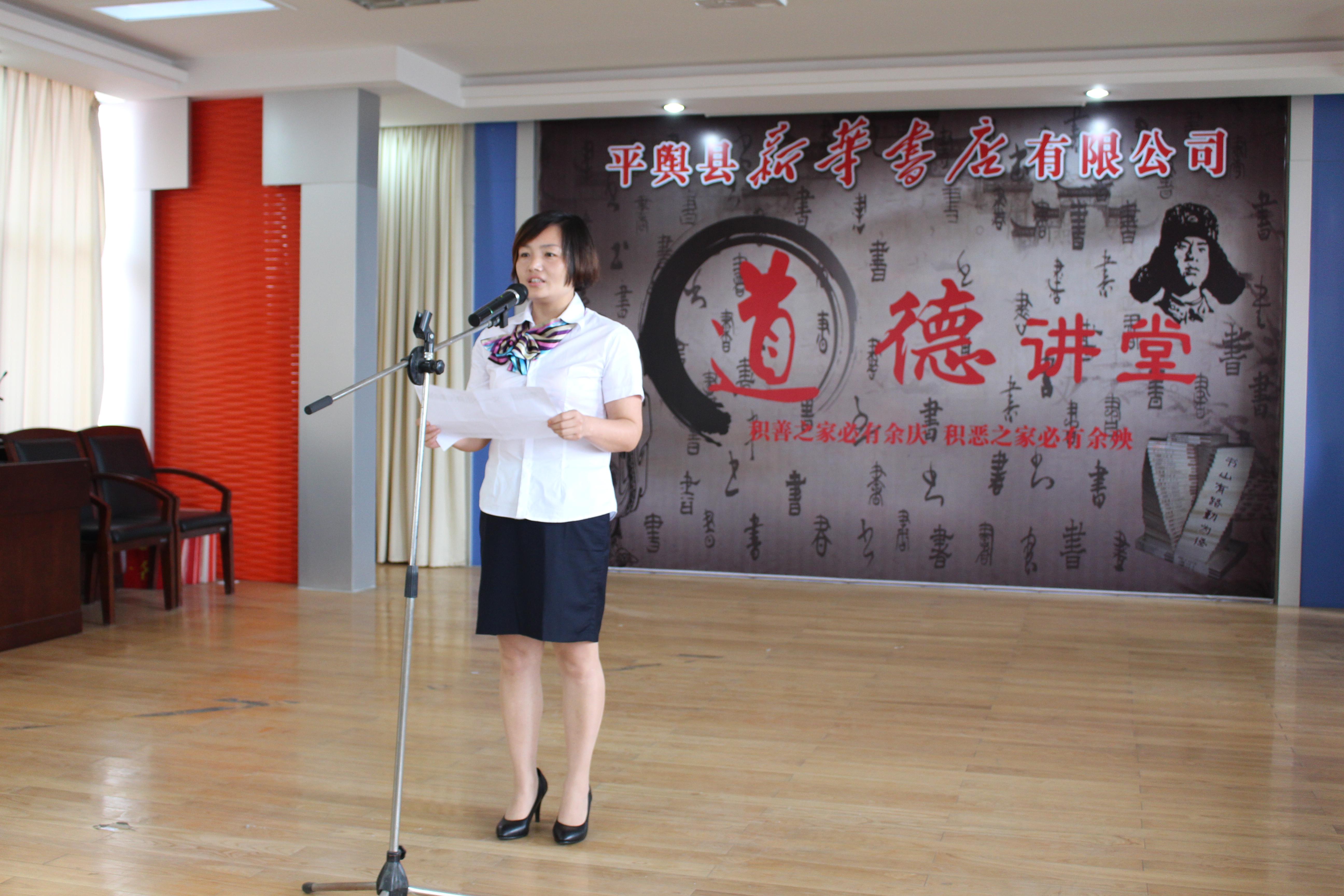 為進(jìn)一步提升道德素養(yǎng),弘揚(yáng)中華民族優(yōu)秀文化、傳統(tǒng)美德和時(shí)代精神,促進(jìn)干部、職工文明素質(zhì)提高。7月24日上午,平輿縣店隆重舉行“道德大講堂”活動(dòng),倡導(dǎo)道德之風(fēng)、傳遞文明風(fēng)尚,打造和諧書店,展現(xiàn)平輿縣新華人的凝神聚力、團(tuán)結(jié)奮進(jìn)、傳遞愛心、無(wú)私奉獻(xiàn)的良好精神風(fēng)貌。我店干部職工六十多人參加了活動(dòng)。