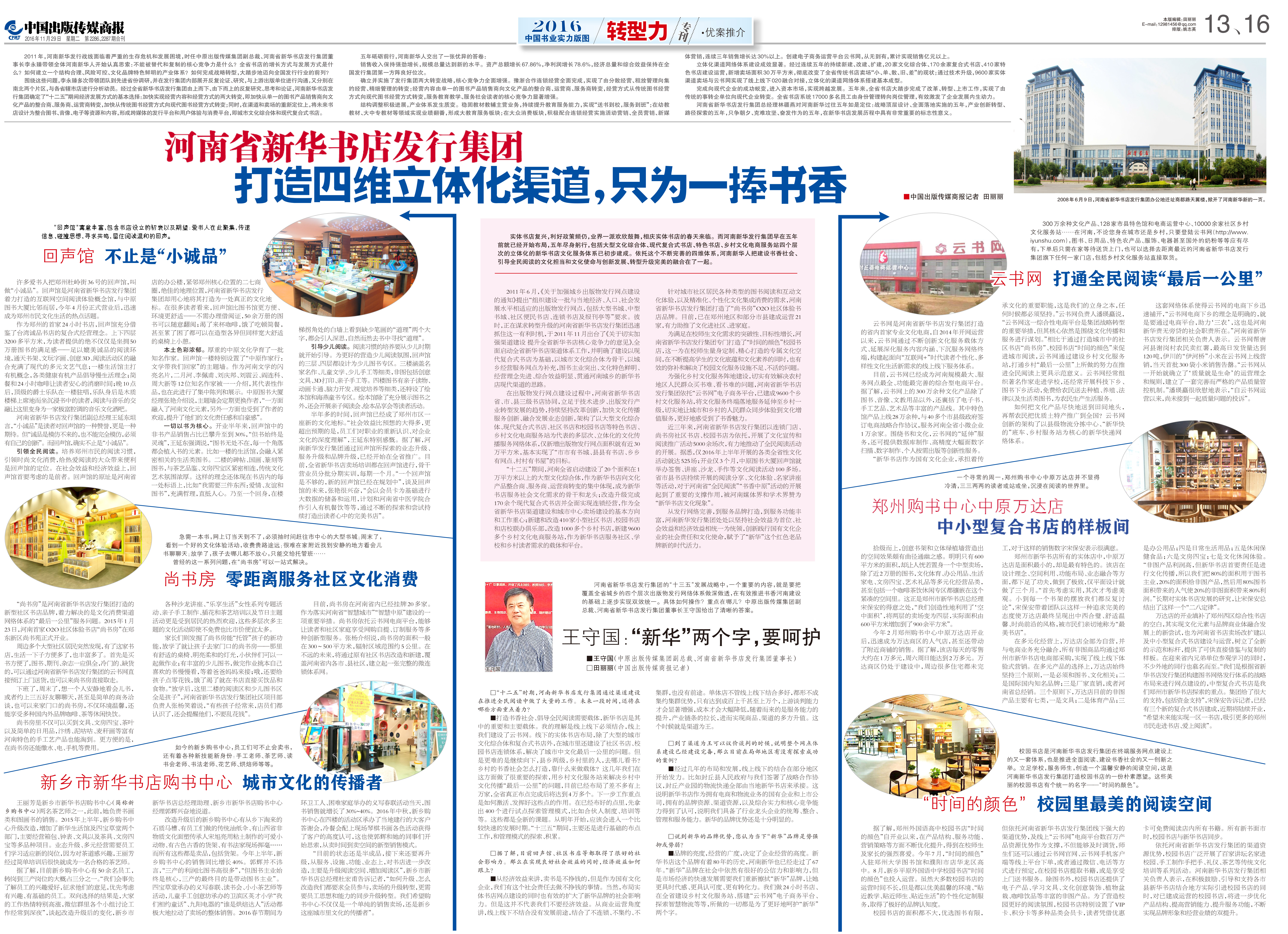 2016年11月29日,中國出版?zhèn)髅缴虉?bào)在2016中國書業(yè)實(shí)力版圖·轉(zhuǎn)型力欄目,以《河南省新華書店發(fā)行集團(tuán)打造四維立體化渠道,只為一捧書香》為題,專題報(bào)道了河南省新華書店,向行業(yè)介紹河南省新華書店多年來在渠道建設(shè)方面的先進(jìn)發(fā)展經(jīng)驗(yàn)。