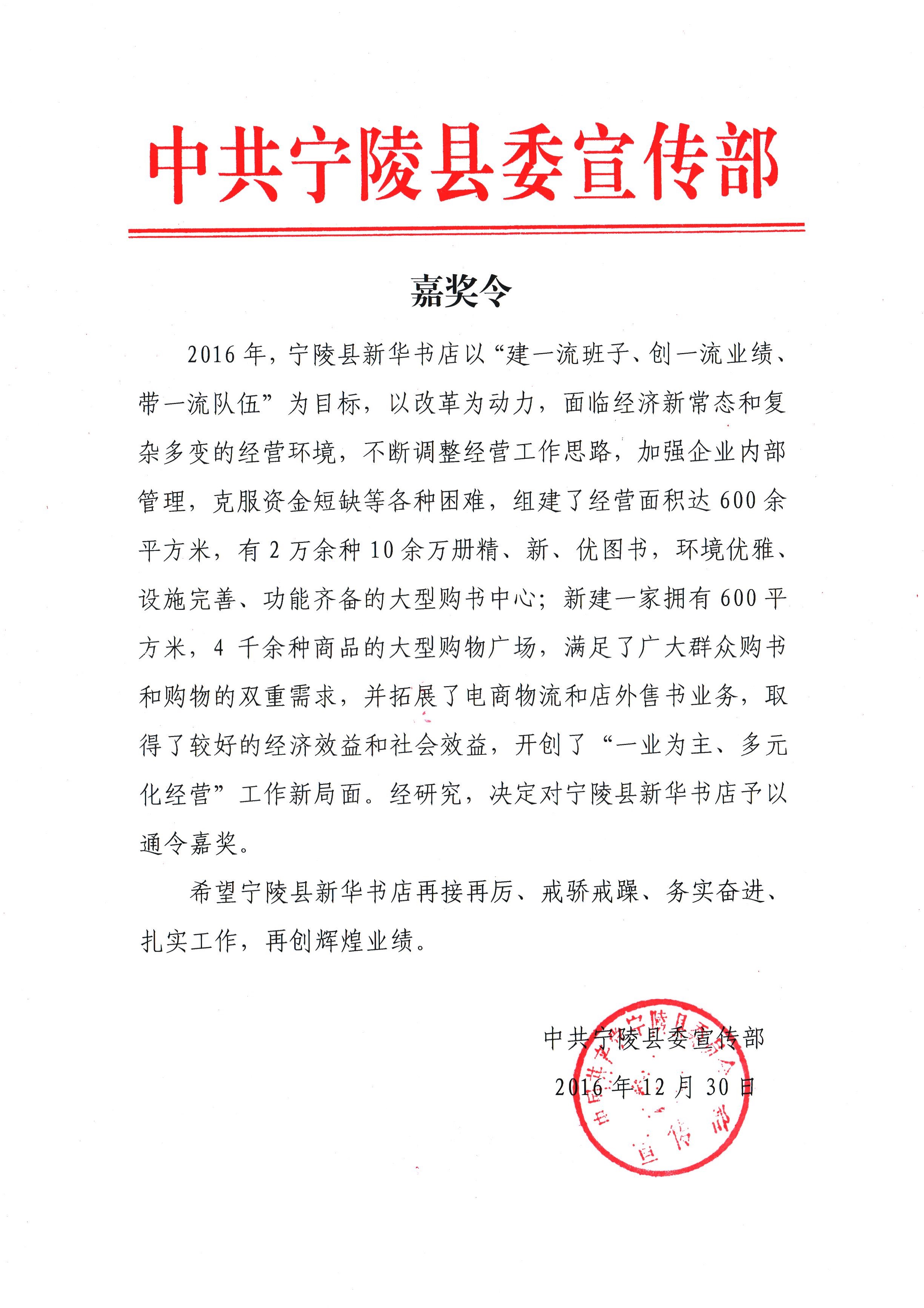 日前,寧陵縣委宣傳部下發(fā)《嘉獎(jiǎng)令》,對(duì)寧陵縣新華書店不斷調(diào)整經(jīng)營(yíng)工作思路、開創(chuàng)工作新局面通令嘉獎(jiǎng)。